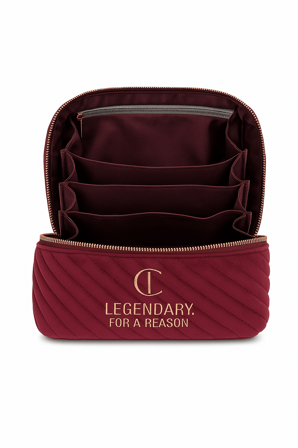 A perfect blend of luxury and practicality, the Charlotte Tilbury Legendary for a Reason Makeup Bag is designed to embody timeless elegance. Crafted from soft, quilted velvet, it brings a touch of sophistication to your vanity or travel essentials. The plush texture is complemented by a sleek gold zipper and the brand’s signature embossed logo — a true reflection of Charlotte Tilbury’s iconic style.