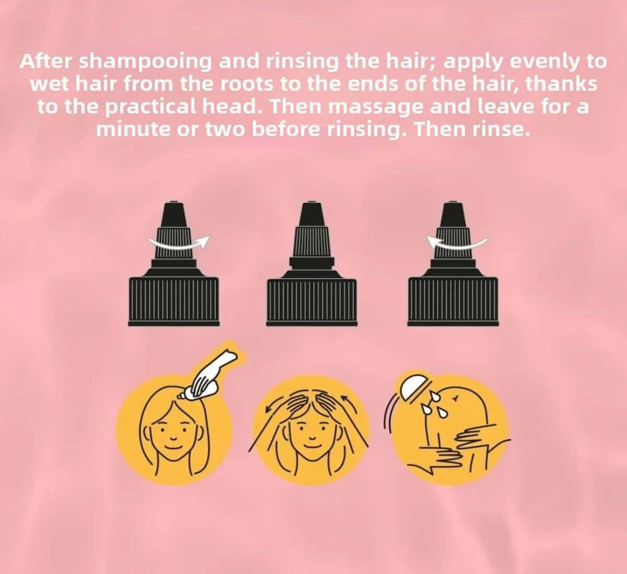 After shampooing, apply evenly to wet hair from roots to ends using the applicator tip. Gently massage the scalp, leave for 1–2 minutes, then rinse thoroughly.