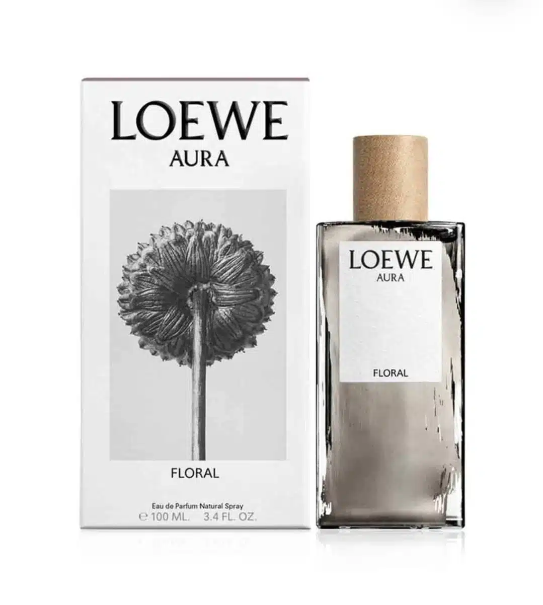 Encased in a minimalist glass bottle accented with a subtle silver brushstroke, Aura Floral reflects the artistic style and modern elegance of the Loewe fragrance house.